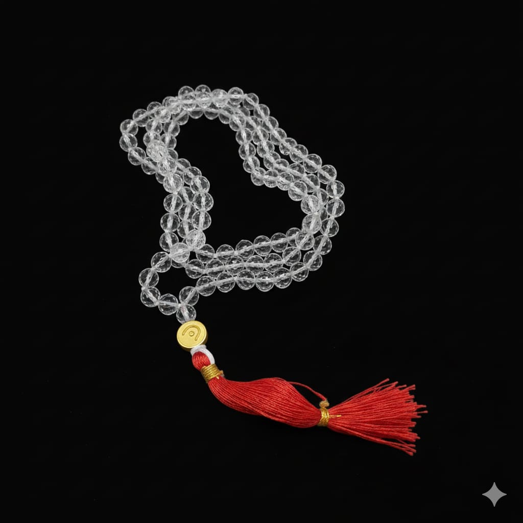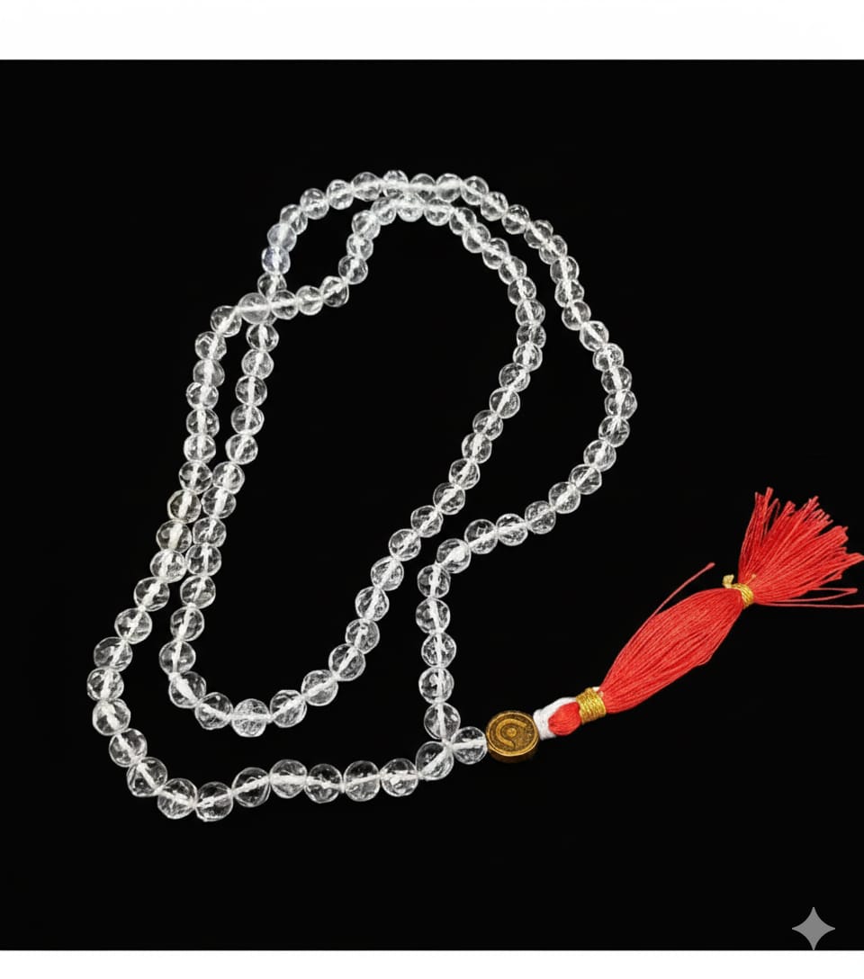 The Sphatik Mala, also known as Crystal Quartz Mala, is a sacred symbol of purity, peace, and divine energy. Sphatik (clear quartz) is considered one of the most powerful and auspicious stones in Vedic spirituality. It absorbs, stores, and amplifies positive energy while removing negativity from the aura.